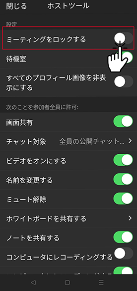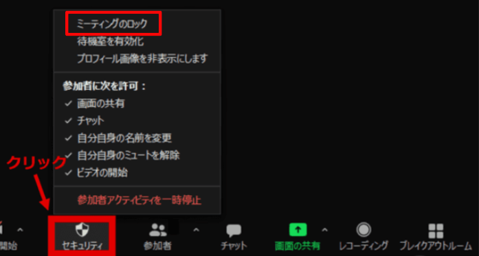 「セキュリティー」→「ミーティングのロック」